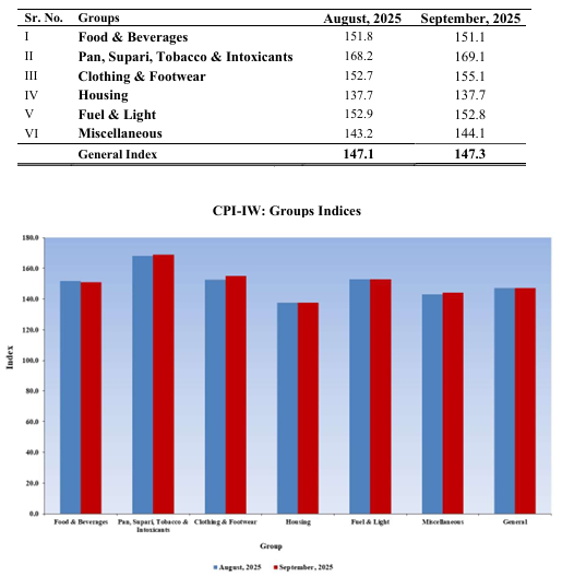 The All-India CPI-IW for September, 2025 increased by 0.2 point to stand at 147.3 (one hundred forty-Seven point Three) from 147.1 in August, 2025