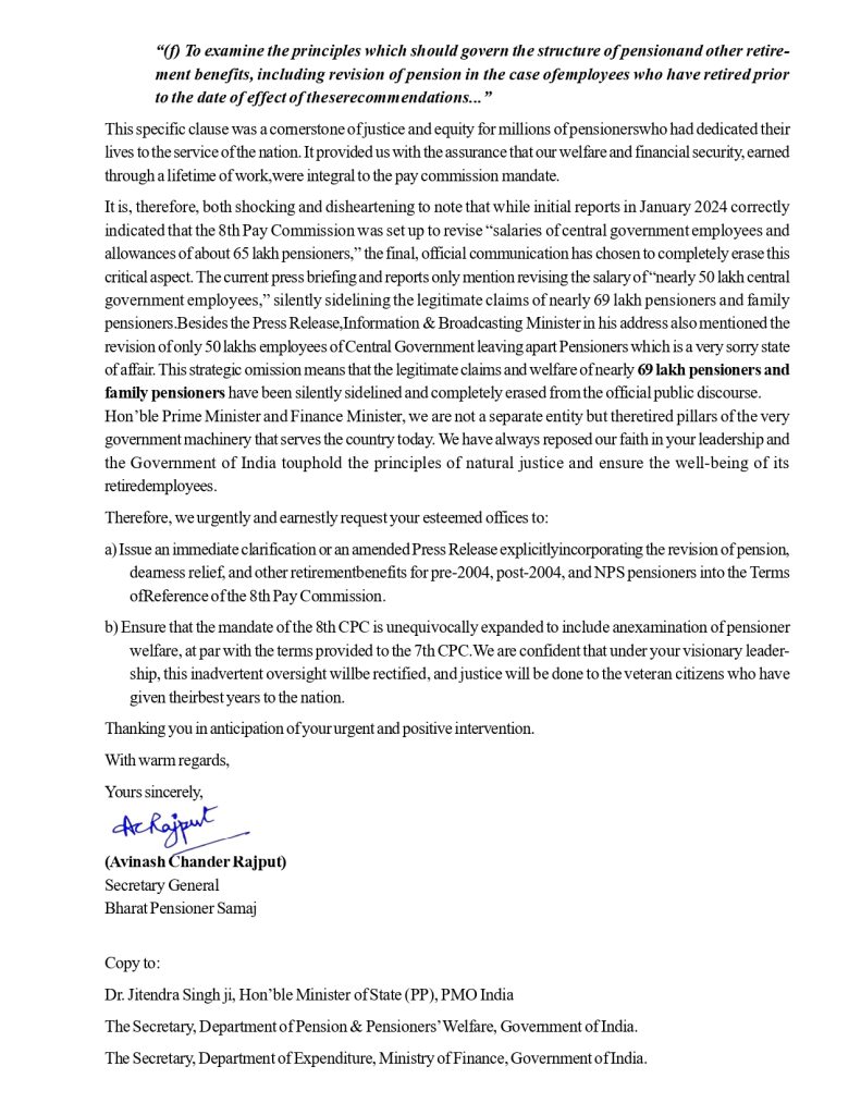 The BPS concludes its appeal by urging the Hon’ble Prime Minister to intervene and instruct the concerned departments to take immediate, corrective action. A swift amendment to the Terms of Reference will not only alleviate the pervasive anxiety among 69 lakh pensioners but will also reaffirm the government’s commitment to ensuring a life of dignity and financial security for its senior citizens, especially with the 8th CPC’s recommendations scheduled for implementation from January 1, 2026.