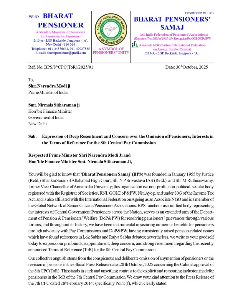New Delhi, October 30, 2025 — The Bharat Pensioners Samaj (BPS), one of the nation’s largest federations representing central government pensioners, has penned an urgent letter to the Prime Minister’s Office (PMO) expressing profound concern and seeking immediate intervention regarding the official Terms of Reference (ToR) for the 8th Central Pay Commission (CPC).
